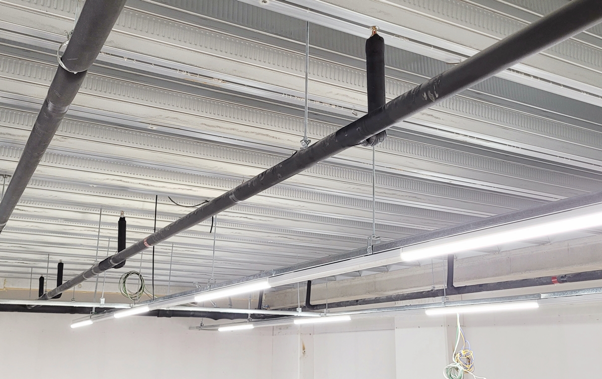 복층 하부에 설치될 스프링클러는 주배관에서 배관을 용접하여 이어붙혀 새로운 가지배관을 설치하게 됩니다. 그렇게 복층 아래부분까지 끌고와 자바라 형태의 스프링클러 헤드를 설치하였습니다.