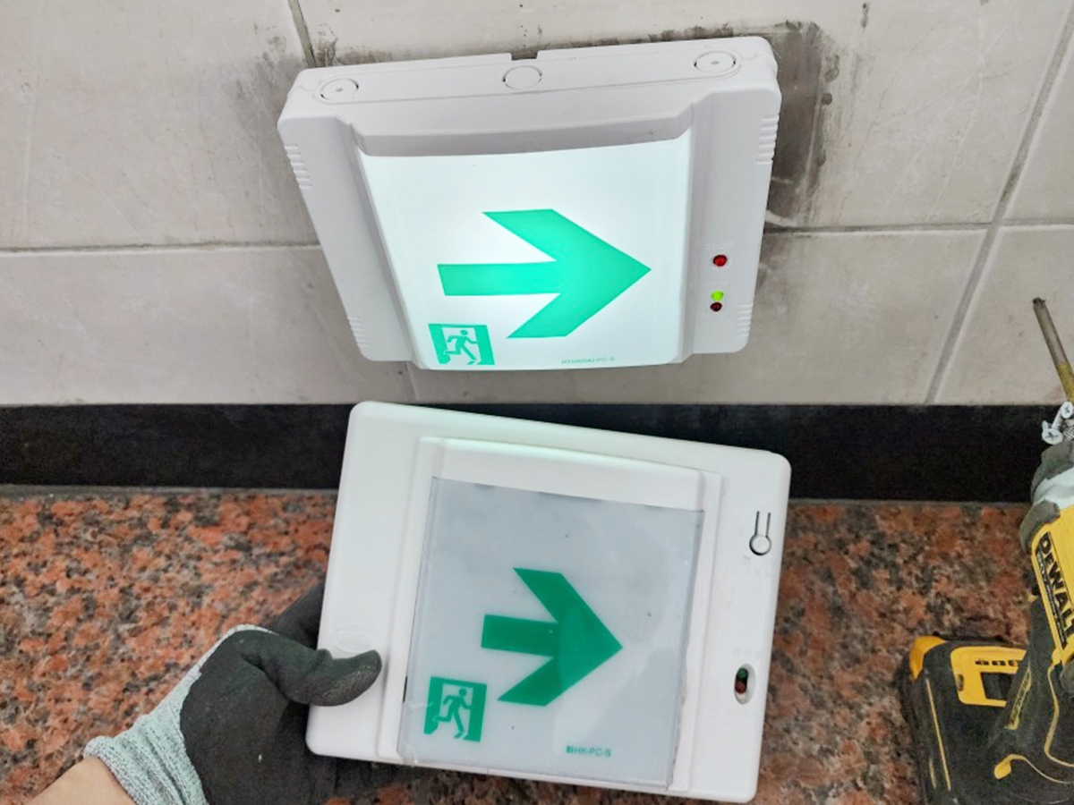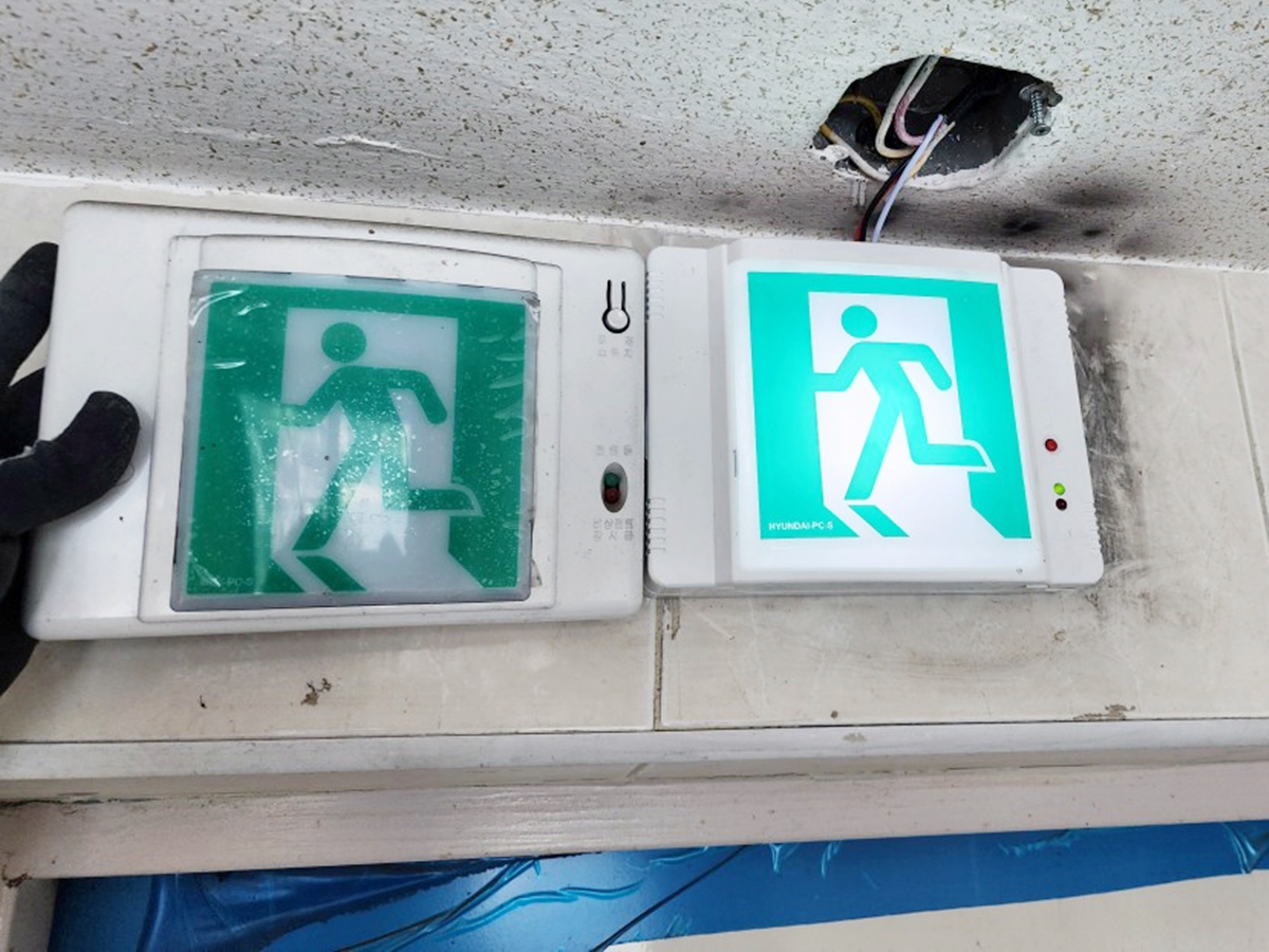 건물 소방점검 후, 지적사항으로 유도등을 교체, 이설 할 현장입니다. 그 밖에도 감지기 증설, 스프링쿨러 헤드 증설, 이설 작업도 이루어진 곳입니다. 매년 작동기능점검 및 종합정밀점검으로 1~2회 이루어지고 있는데 오래된 건물이라면 새로 설치할 소방시설들이 많을 것입니다. 그밖에 소방 관계인이 직접 처리 못할 소방펌프, 배관 수정 같은 어려운 작업들은 소방설비 업체에 의뢰하는 게 좋습니다.