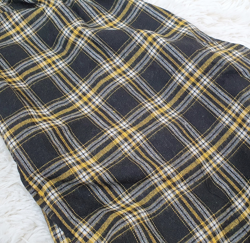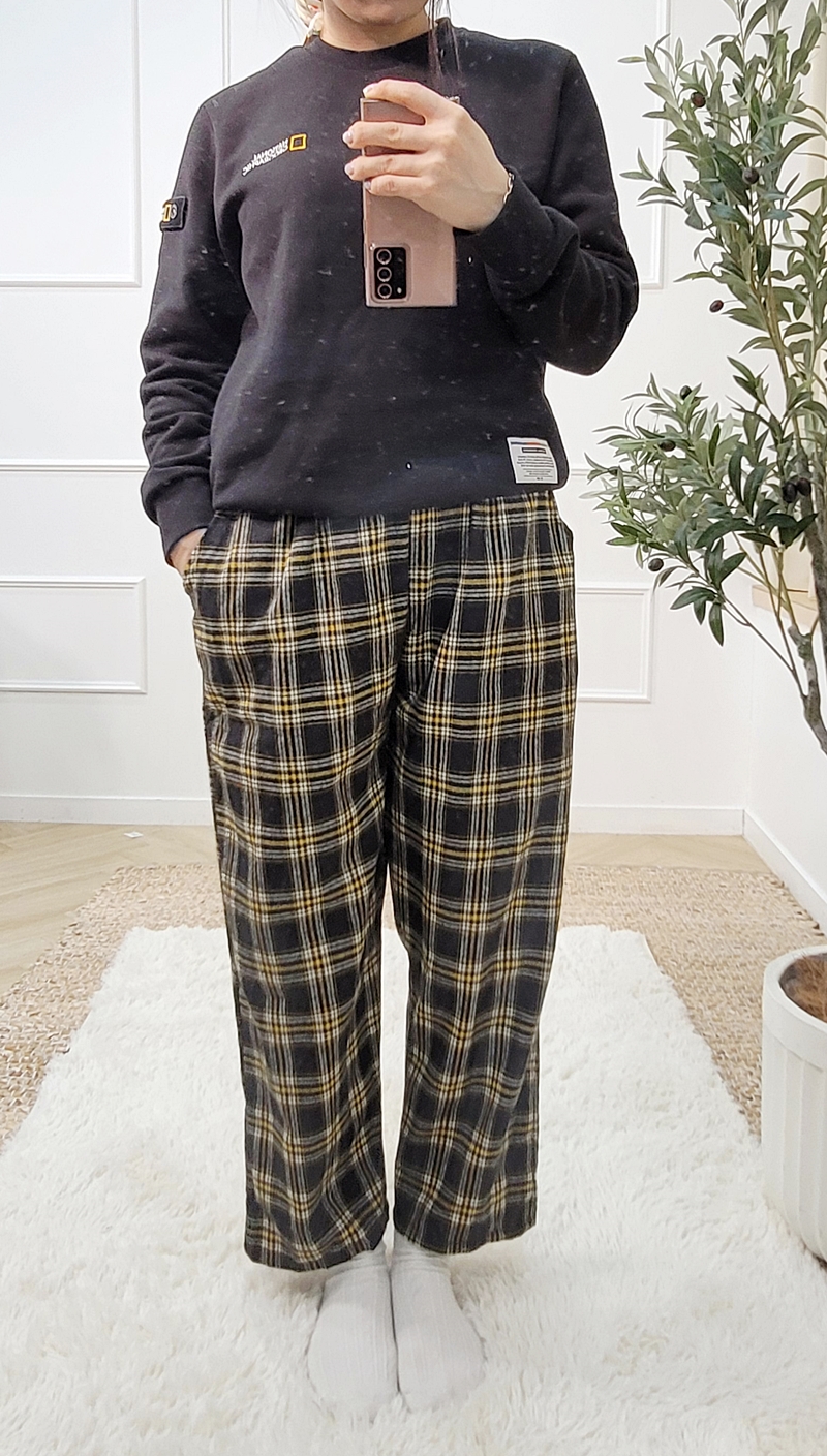 검정 바탕에 노랑색, 흰색 체크무늬의 바지로 긴바지가 아니라 9부 기장으로 복숭아뼈 정도 길이가 떨어집니다.
