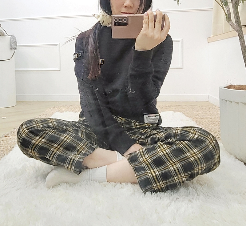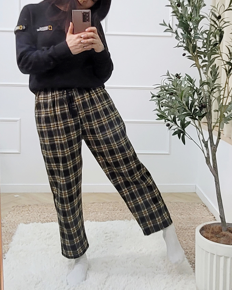수면바지의 경우 주머니가 없는 경우가 많고 그리고 캐릭터 혹은 화려한 색상으로 바깥에 나갈때 입기에는 조금 무리인 경우가 많았는데 색상이며 체크패턴이 잠깐 나갈때 입어도 그렇게 부담되지 않는 디자인인 것 같습니다.